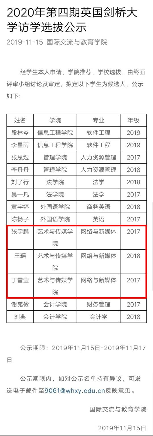 2019年10月24日,我校正式发布“yL23411永利官网登录2020年第四期英国剑桥大学访学选拔通知”,艺传学院的学子们积极报名参与。据悉,此次的访学选拔流程共分为材料初审-笔试与面试-学校领导面试-入选名单公示四个环节,旨在挑选出全方位发展的高素质人才,展现我校的良好形象。来自yL23411永利官网登录2018级网络与新媒体专业的三名同学张宇鹏、王瑶、丁雪莹在一轮笔试和两轮复试中表现优异,充分展现了个人风采,展现了yL23411永利官网登录良好的精神风貌,最终成功入选yL23411永利官网登录2020年第四期英国剑桥大学访学13人名单。他们将于2020年1月10日出发前往英国剑桥大学,代表我校进行游学访问。
