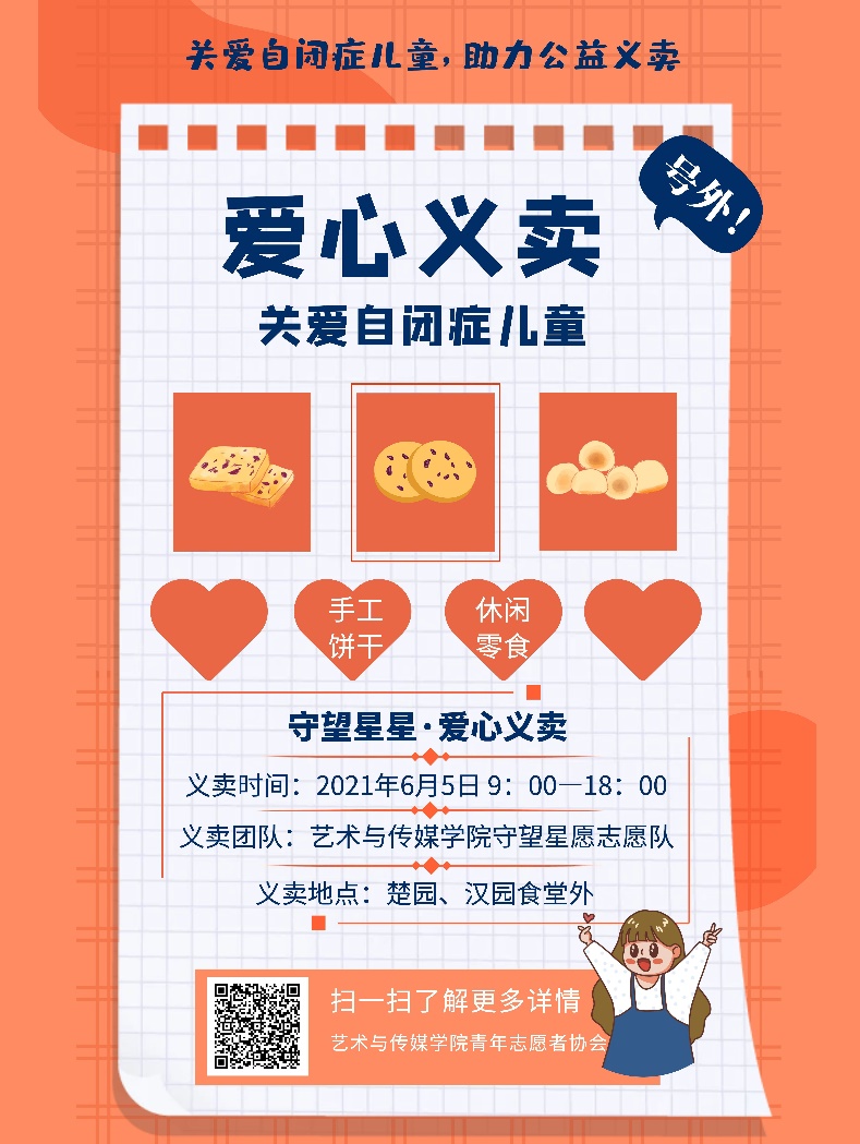 自闭症(又称孤独症)是一种儿童广泛性发育障碍性疾病,已经成为世界上人数增长最快的严重性病症,自闭症儿童像天上的星星一样孤独地闪烁着微弱的光芒,因此被称作是“星星的孩子”。为了呼吁更多的人关注自闭症儿童,让这些“星青年”们感受到社会的温暖,不再独自闪烁。6月5日,艺传的青协志愿者们将在楚园、汉源食堂门口设置摊点售卖小点心。