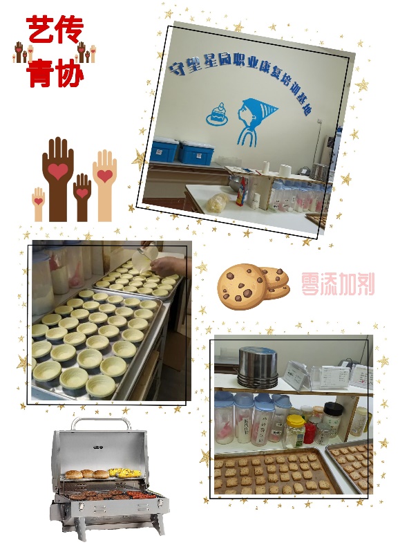 楚园及汉源食堂摊点中摆好精心制作的小点心。这些点心都由“星青年”们亲手制作。在甜品完成制作后还需要精美仔细的包装,而这些包装也是由“星青年”们亲手完成的。蔓越莓曲奇的塑封,外包装纸盒也是由“星青年”们一个个叠好的,包括装盒等一系列程序皆是“星青年”们自己动手完成的。