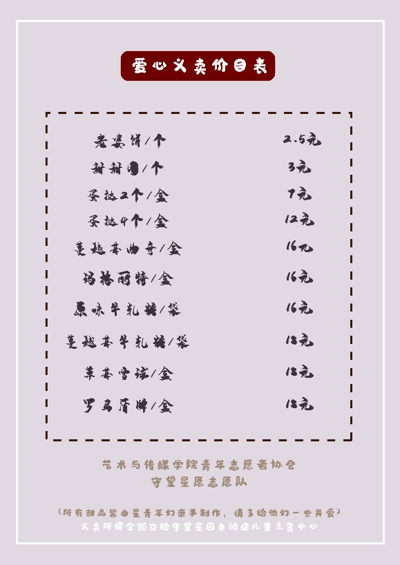 通过义卖手工的方式进行志愿活动,活动所得将全部捐献给自闭症儿童救助中心,用来帮助需要的人。同学们在寻找自己感兴趣的小零食的同时也能为这些星青年们奉献一点爱心,为儿童们孤独的内心也带来一丝温暖!期待大家周六的光临!