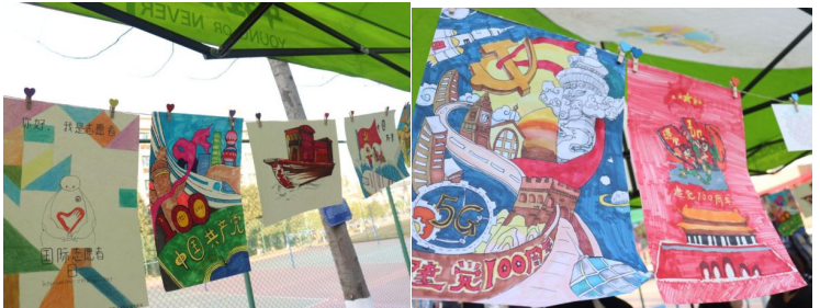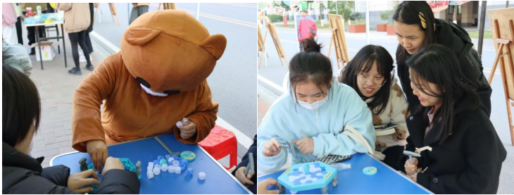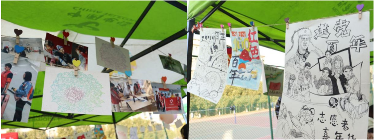 12月2日则是同学们十分期待的文化作品展,早上8点志愿者们便早早来到明德大道旁开始布置摆点,棚子上挂满了同学们的红色绘画作品和志愿服务时留下来的美好瞬间。听歌识曲和营救小企鹅的游戏吸引了众多同学来打卡参与,丰厚的奖品更是让参与游戏的同学们想要留下来当擂主。