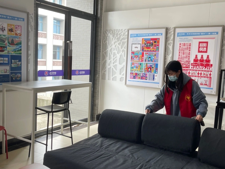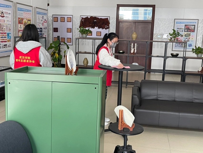 待志愿者们穿着齐整后,便正式开始了本次的志愿活动。在活动负责人的明确分工下,志愿者们也各尽其责,按照要求将展厅中的桌椅认真擦拭一番,没有遗漏每处灰尘,并在打扫完后仔细认真地将桌椅一一归置原位。在整个志愿服务过程中志愿者们的表现合理有序,分工明确,没有懈怠地参与活动。在完成的过程中,志愿者们也会交谈展柜中的作品。经过志愿者们的努力,打扫过的区域、卫生死角纷纷旧貌换新颜。