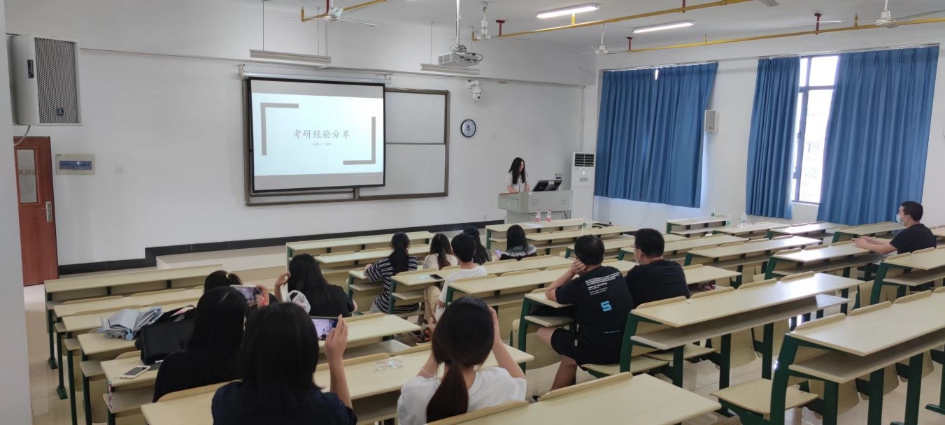 杨庆晶老师向参与分享会的同学们介绍了本次分享会的六位分享人,分别是2022届毕业生彭健芳、邓梦如、郭彩虹、马文璐、喻焯以及郑心怡同学,他们同学根据自己的经验,围绕考研目标的制定、学校的选择、如何调整考研心态、复习资料选取、复习规划及要点、调剂录取等问题,全方位多维度地向学弟学妹们进行了分享与解读。郑心怡同学因实习原因无法返校,特地录制了一段视频向同学们分享自己考研的心路历程与个人感悟。台下的同学们听得聚精会神,感觉收获颇丰。分享完毕,老师们特地安排了交流提问环节,19级的同学们踊跃地就自己感兴趣的考研升学问题对学姐们提问,从考研规划、院校选择、复习要点等方面展开了深入交流,会场洋溢着浓郁的学习劲头。