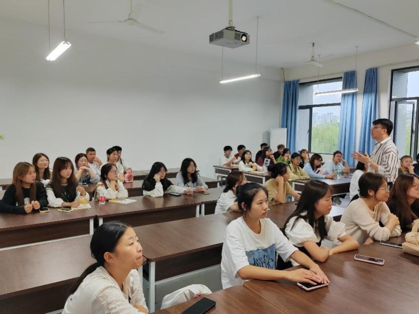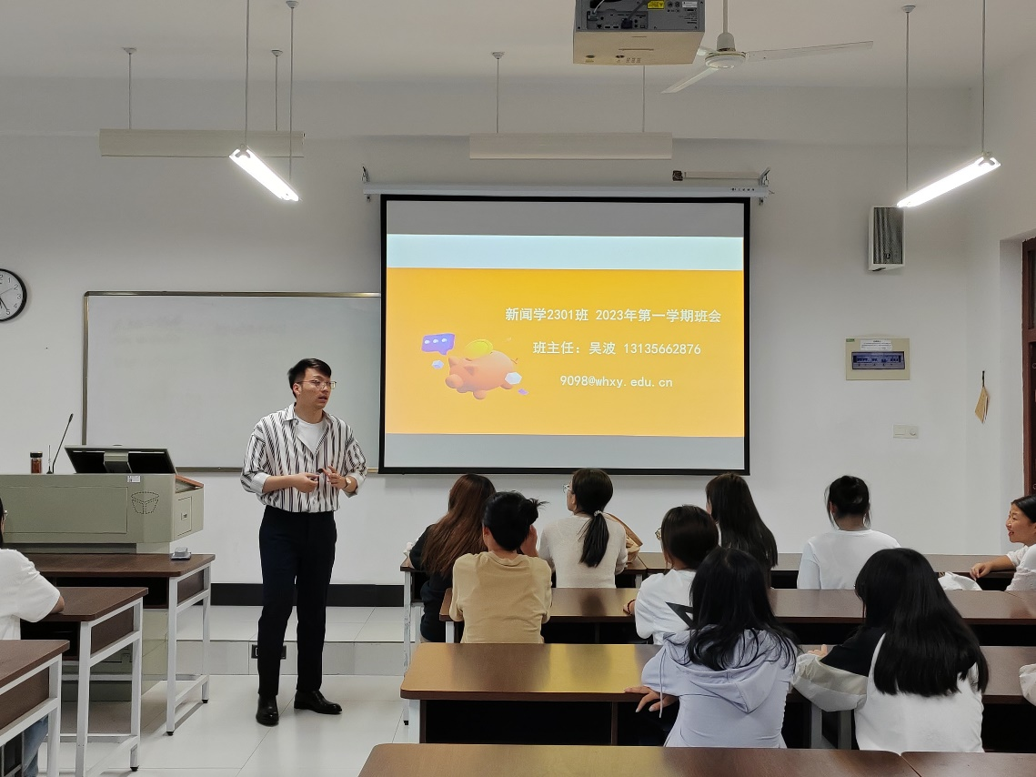 班会在班主任吴波老师的自我介绍下拉开序幕,简短的自我介绍后,同学们对班主任开始熟悉起来。吴波老师详细介绍了新学期的学习计划与安排,提醒新同学们注意课程的时间安排、早晚自习时间、寝室相关规定等等。针对大学课程学习与高中学习的差异,提醒同学们尽快调整好状态迎接崭新的大学生活。