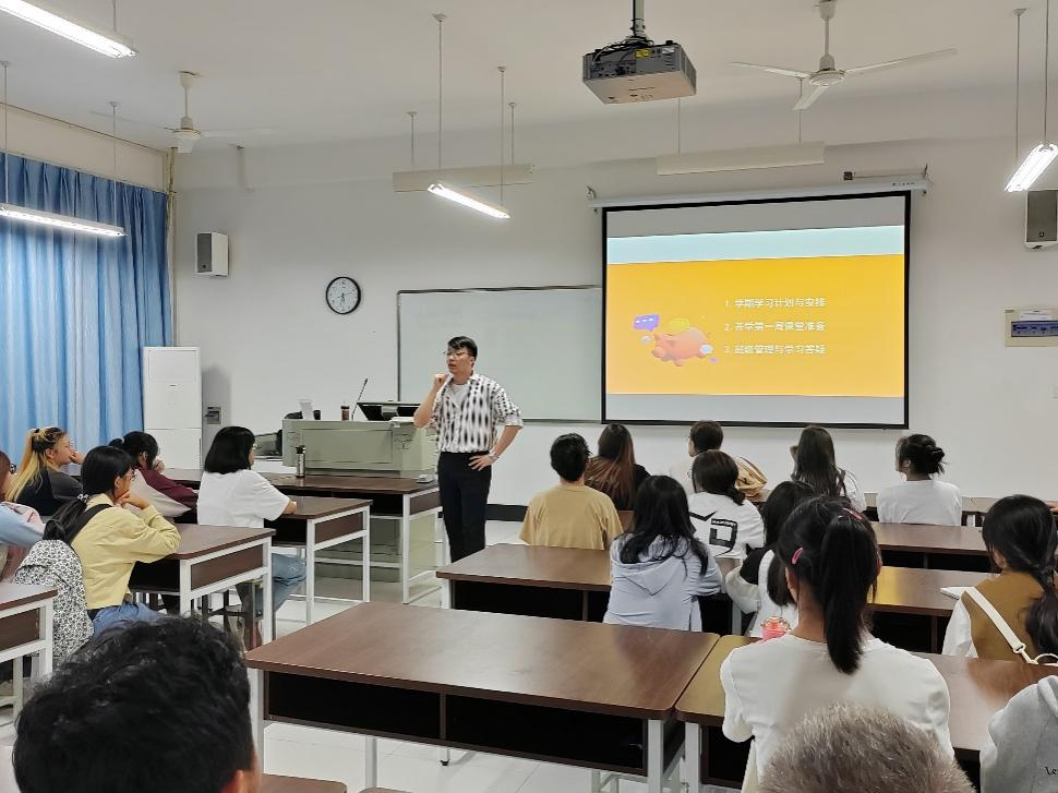 最后,吴波老师简要介绍了班级管理和学习答疑方面的工作。同学们大多数对大一是否能考四六级、大学课程如何请假、奖学金等有关问题很感兴趣,吴波老师耐心解答的同时还邀请了朋辈导师易佳欣为同学们答疑解惑。他表示,作为班主任,他将全力支持同学们的学习和成长,与同学们保持高频词的了解与沟通,及时解答他们在学习和生活中遇到的问题。此外,他还鼓励新生们积极参与班级活动和学校组织的各类活动,培养自己的团队合作和交流能力,让新同学们对未来的大学生活充满了期待与向往,大家都整装待发,以昂扬的姿态做好准备,迎接新学期、新生活的到来。
