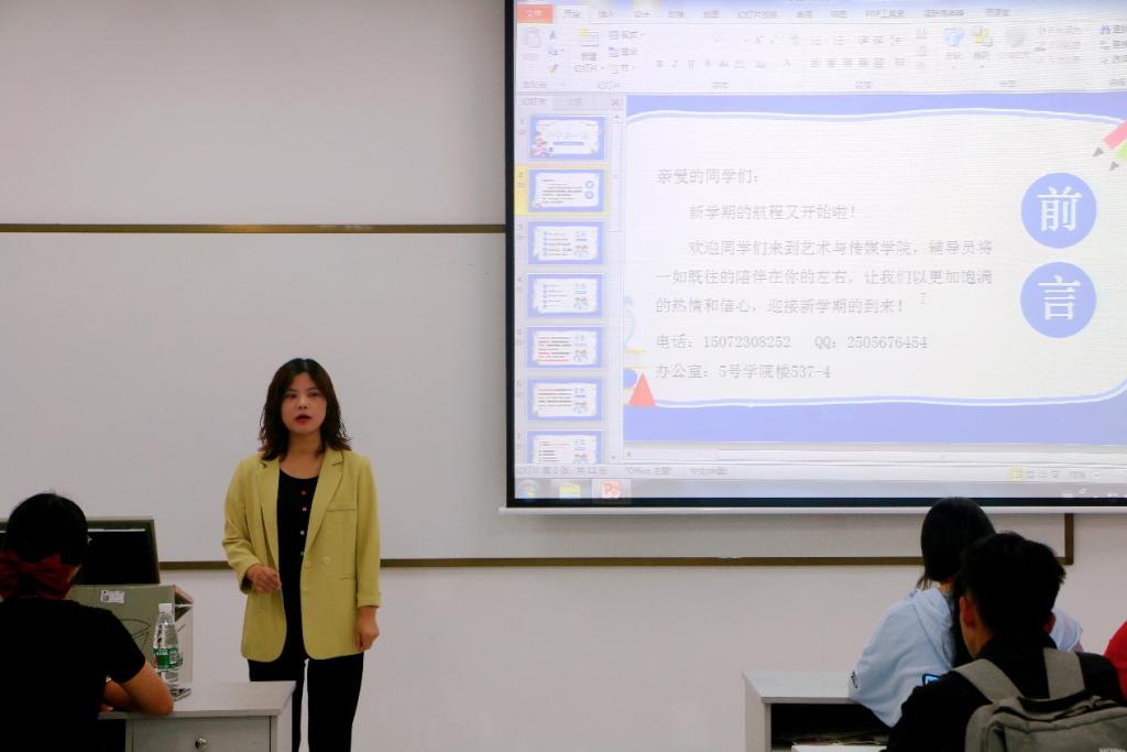 “同学们大家好,我是辅导员杨喻老师,欢迎同学们来到艺传学院,扬帆起航,蓄势待发。”简单的自我介绍后,杨喻老师开始了今天的“课堂内容”。杨老师提出同学们一定要牢记周日晚点名时间,非特殊情况不可缺席,无法参加也要向老师请假沟通。