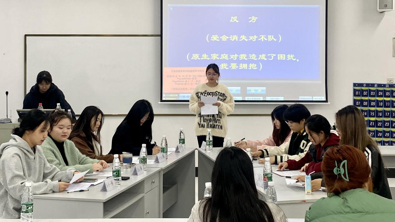 第二场辩论赛于下午2点在学5207开展,本场辩论赛的辩题为“爱与被爱谁更幸福”。正反方辩手分别就对爱与被爱的看法展开激烈的辩论,语言缜密精练,引发现场观众强烈共鸣。正方认为爱的本质是付出,当我们爱上一个人时,我们会不自觉地为对方付出,过种付出会让我们感到愉快和满足,从而感受到自己的价值和意义。然而反方认为被爱是爱的前提,被爱让我们产生心理上的满足,为我们提供了情绪价值,更容易产生幸福感。