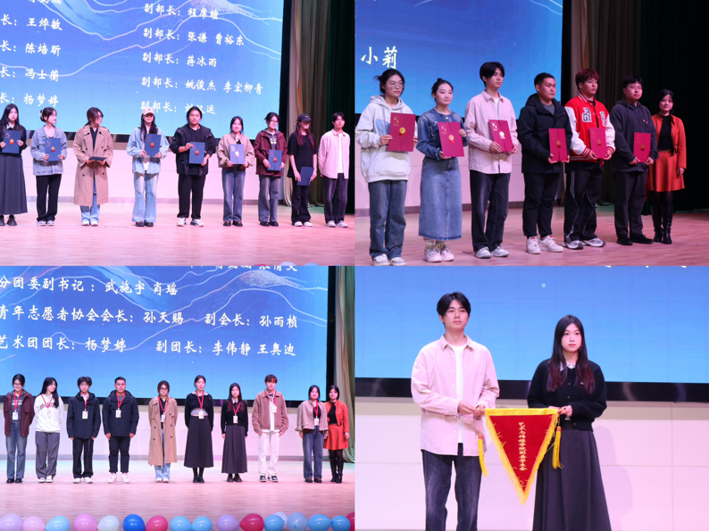 表演结束后,团委书记杨喻老师为上一届学生干部颁发聘书以及为现任主席团颁发工作牌。在这个隆重的氛围中,上一届团委学生会主席杜鑫鑫与第六届团委学生会主席明雨丽进行了交接仪式。标志着新一届团委学生会主席团接过了团委学生会的重任。