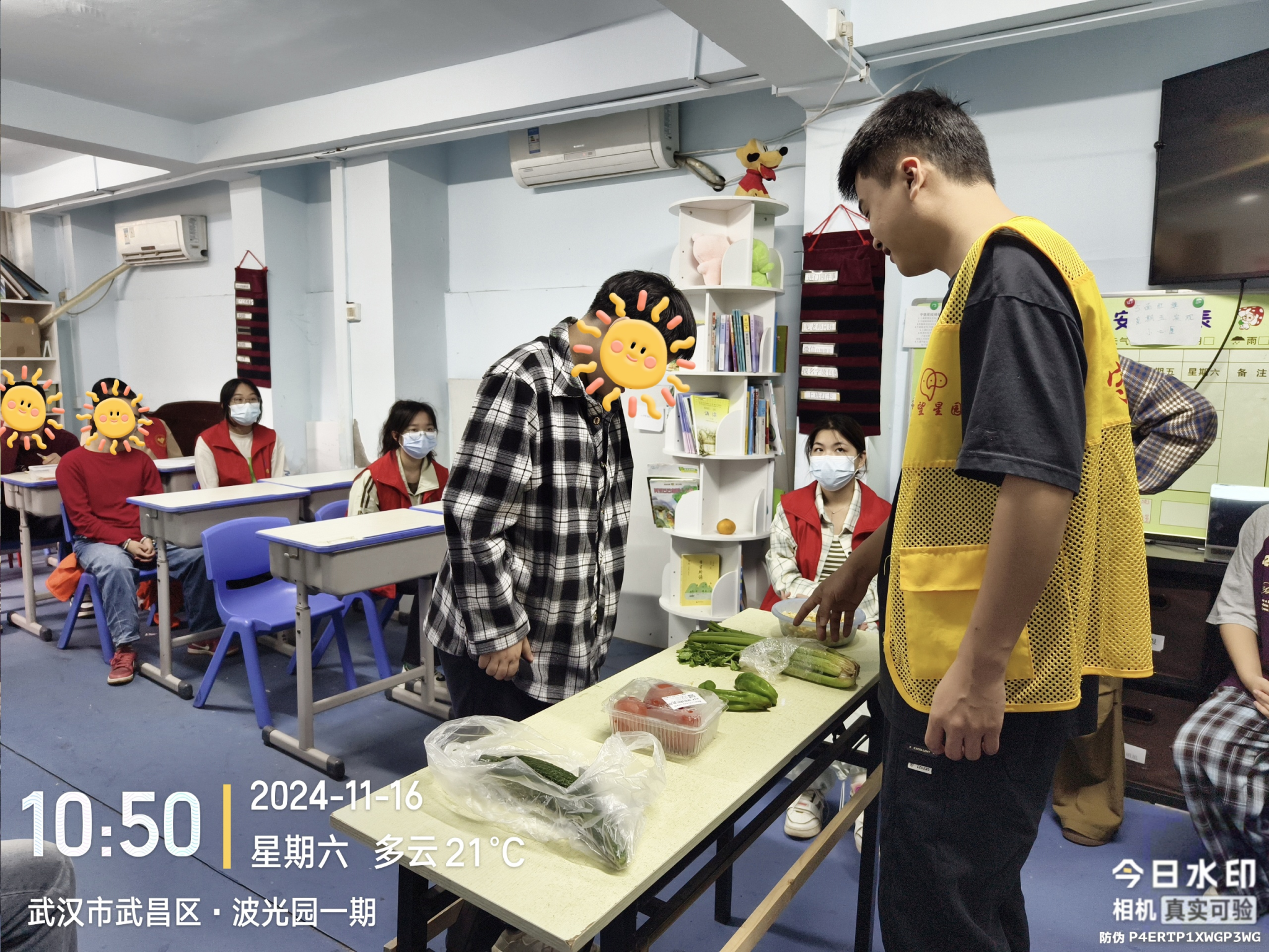 在活动现场,老师给大家上了一堂课——居家生活。志愿者们耐心地陪伴着守望星园的孩子们,认识蔬菜。然而这次孩子们都能很快认出蔬菜,流利的说出蔬菜的名字,有很大的进步!志愿者们也感到无比的欣慰!每一个孩子的进步,都离不开志愿者们的陪伴和付出!