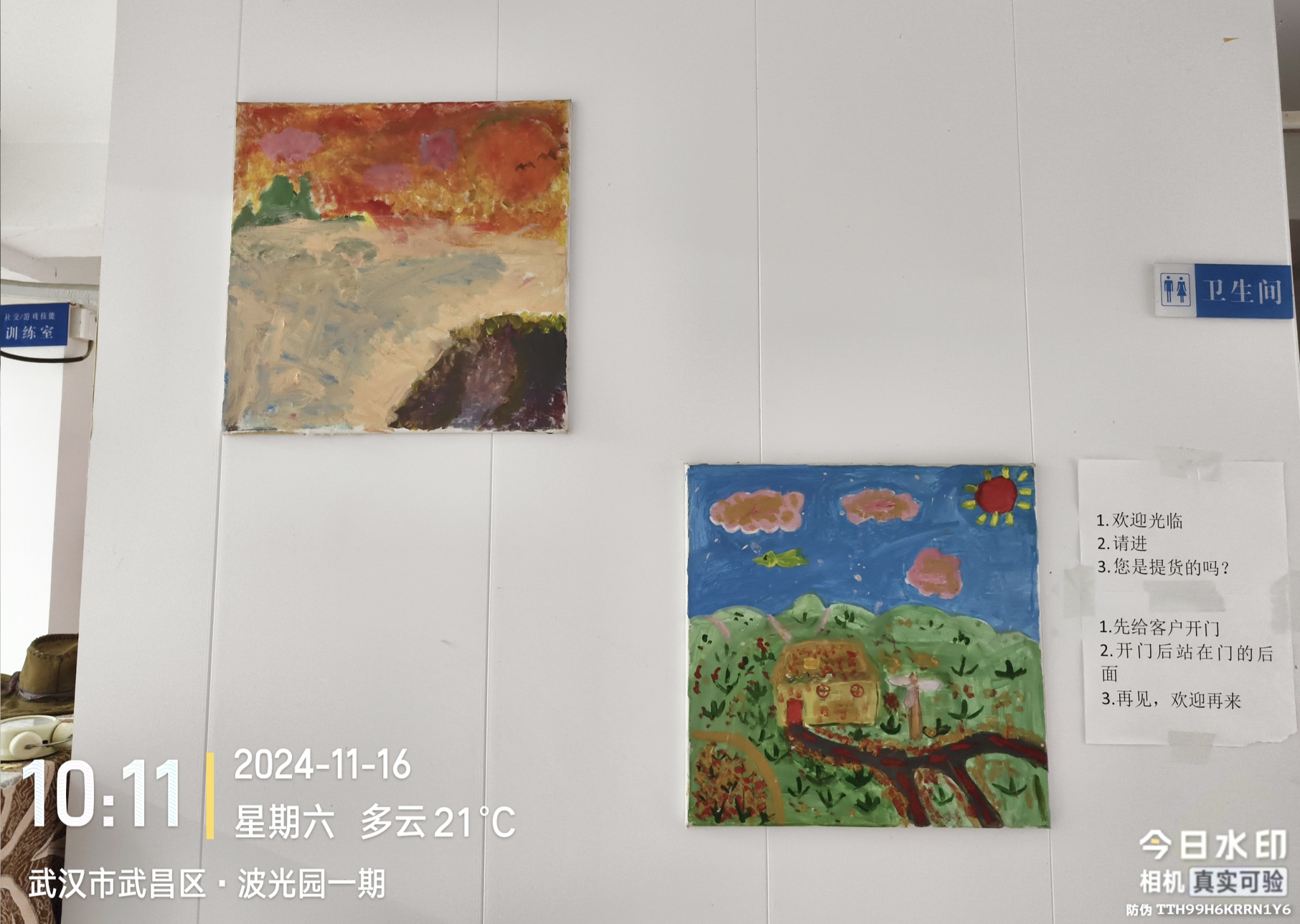 踏入守望星园,首先映入眼帘的是色彩斑斓的装饰和温馨的氛围。这里是自闭症儿童的专属天地,每一处设计都饱含着对他们的关怀。教室里,摆放着适合孩子们学习和游戏的特殊教具,墙壁上贴满了他们充满童真的画作。这些作品,就像是他们内心世界的一扇扇窗户,虽然笔触稚嫩,但却独特而珍贵。志愿者们到了地方后,帮他们清理柜台。经过一番认真擦洗,柜台变得更加亮堂!孩子们的作品也变得生动起来!