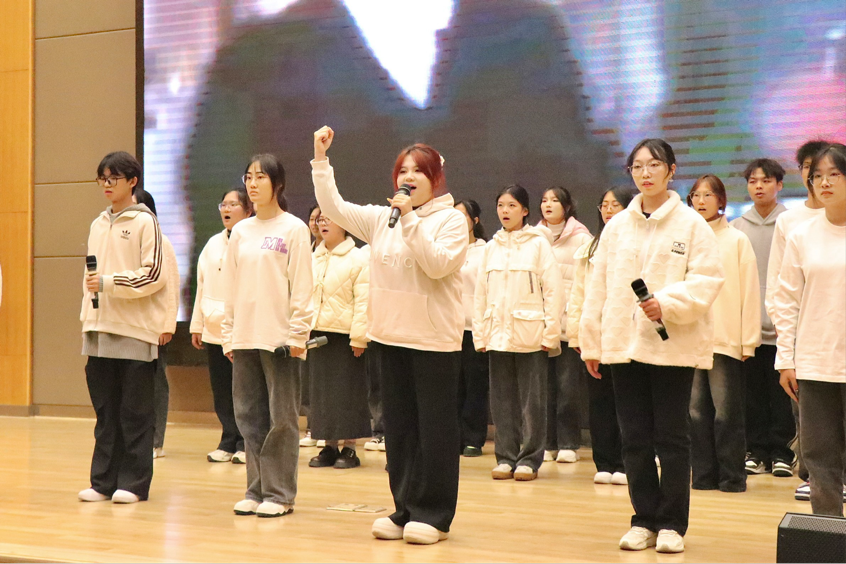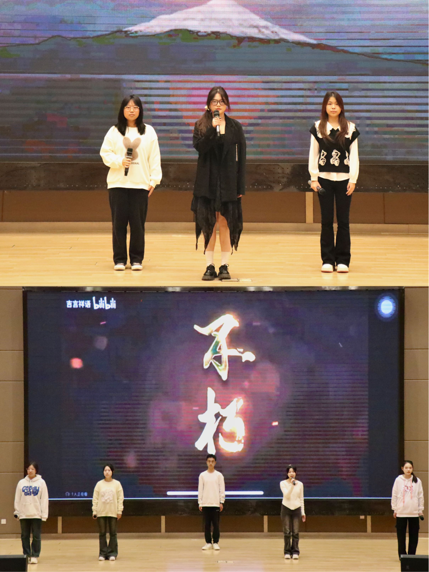 《我爱这片土地》由郭佳同学单人进行朗诵,她以深沉而真挚的情感,表达了对祖国大地的热爱与眷恋,让观众仿佛置身于那个风雨如晦的年代,感受到仁人志士对祖国命运的深切关怀。《百年沧桑》由我院主持队与合唱团共同演绎,伴随着合唱团细腻的《如愿》和声,朗诵者们用激昂的语调追溯了中华民族百年间的坎坷历程,一字一句都饱含着对历史的敬畏与对未来的信心。《青春》的朗诵者们用铿锵有力的声音诉说着先辈们“生于青春死于青春,生于少年死于少年”的热血与担当,展现了当年青年学生们为了国家的独立和民族的解放,不惜抛头颅、洒热血的壮烈情怀。