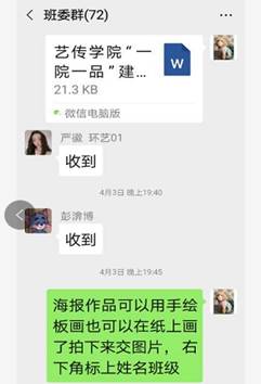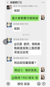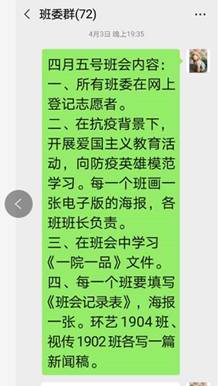 除了“在线担心”学生的身体健康以外,王老师还十分“在线操心”学生们上网课的情况。王老师每天至少进4个课堂听课;每天与每个班的班干部进行线上沟通班上情况;经常与上课老师联系,一起维持上课秩序;提前布置班会主题等等。在线上工作中,面对线上课堂有少数学生起不了床,学习迟到以及上课发言不积极的问题,王老师说道:“我会与迟到的同学单独电话联系或者微信联系,进行批评教育。对于网课中学生课堂发言不积极的情况,我和授课老师就一起商量,然后采取一些切实的措施”。在王老师的努力下,学生上课迟到、回答问题、提问不积极等问题已经得到了很大的改善。