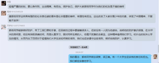 随后,同学们组织学习了,郭岳、刘智威、高仁俊等榜样的先进事迹,环艺1904班的刘林峰同学说道,“开这次主题班会让我们知道防控疫情,必须全国一盘棋,让每条战线上的每一个人都有防控意识,作为我院的一名成员更要学习这些抗疫情的优秀代表们。”