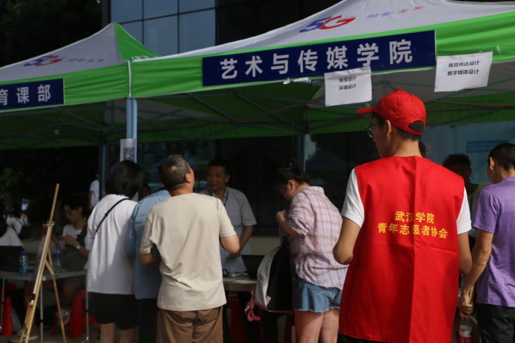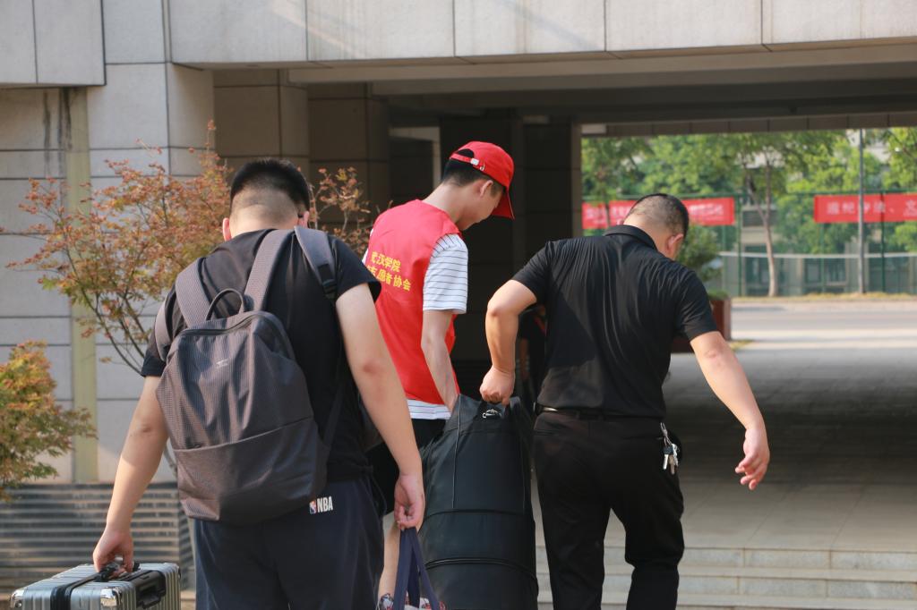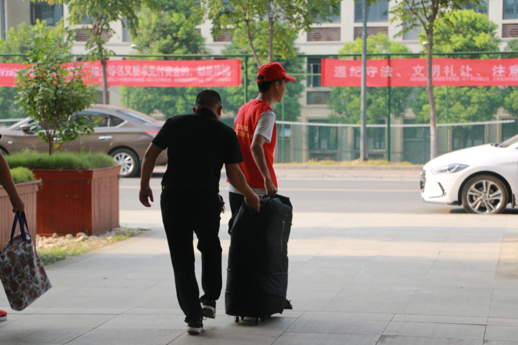 早上八点开始,前来报到的人陆陆续续的多了起来。他们一大部分是武汉当地的,少部分是从很远的地方来的。期间新生们几乎都是家长陪同,他们带着大袋小包的行李和家长一起被大巴车拉到学校,然后校青协的“红马甲”们会立刻到校车处帮新生和家长们拿行李,并引导新生到自己所在院系报到,或者帮新生拿着各式各样的行李去他们各自所在宿舍。在体感温度大于30摄氏度室外,不停做着繁重的接待任务,非常耗体力和精力的。人群中仍然闪现着忙碌的红色身影。