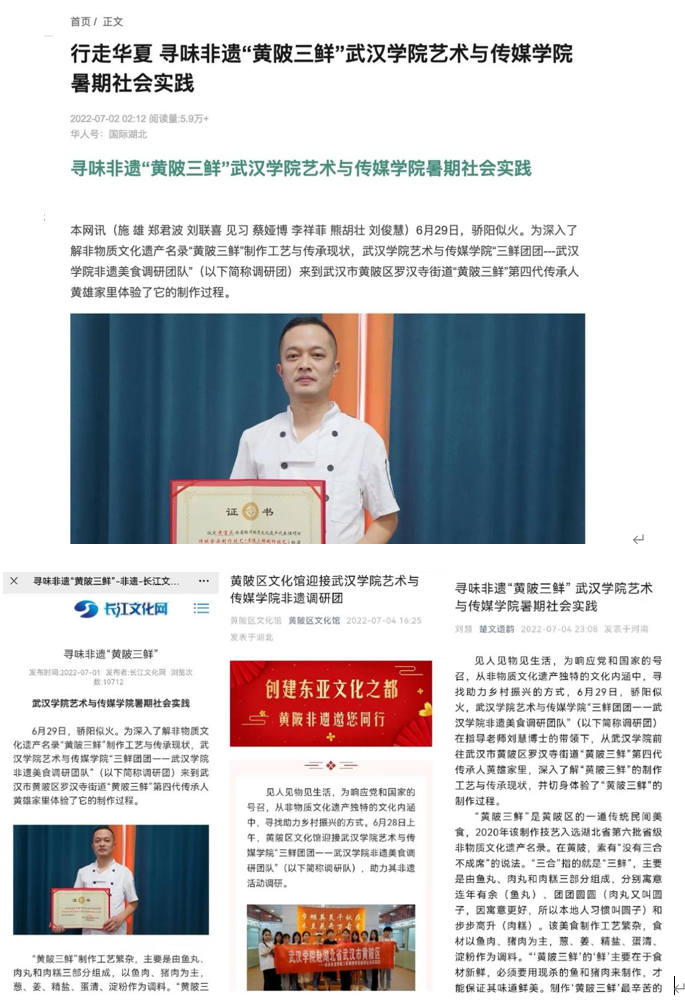 近日,yL23411永利官网登录“三鲜团团——yL23411永利官网登录非遗美食调研团队”赴黄陂区开展“黄陂三鲜”调研活动,受到了长江文化网和华人头条国际湖北的关注,楚文遗韵(《湖北省文化遗产保护与研究工作》公众号)和黄陂区文化馆公众号也进行了报道,共计6万+点击量。
