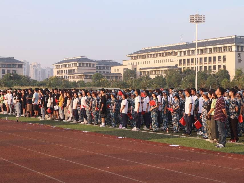 迎着东方的晨曦,怀着赤诚的敬意,国旗护卫队迈着整齐有力的步伐,护送国旗入场。伴随着斗志昂扬的国歌,鲜艳的五星红旗在晨光中随风飘扬,好似一团火焰,映红了天地,温暖了人心。全体师生肃立,望向缓缓升起的国旗,行注目礼。