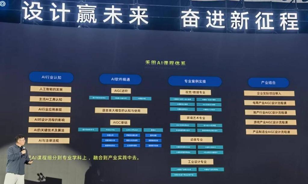 本次博览会还邀请了高校教师与企业设计师进行专题发言与设计对话,共同研讨推动产业生态体系重构的创新之路,探究设计赋能制造业高质量发展的关键问题与进路,进而为推动新型工业化建设赋能,为实现工业产业数字化、智能化、绿色化转型建言献策。阿里国际发布了三款设计生态工具,具有AI绘画、AI模型创作、AI图像和视频处理等功能,将携手各大院校,共同培养具备AI设计能力的新一代设计师。禾田星锐教育集团副总裁刘峰对人工智能大潮下,设计教育人才培养方向做出了详细的报告与交流,并且在一定程度上能够提供指导数智化教育培养方案的相关数据。