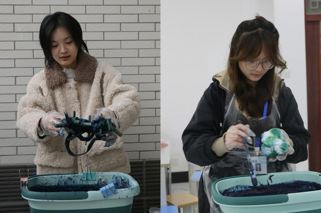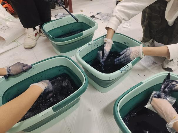 活动开始前,工作人员们精心组织报名工作,采用线上、线下结合宣传形式,受到同学们的热情关注,报名人数约莫500人。为了让活动顺利进行,组织人员提前筹备了充足的物资与染料,12月1日下午3点在学523室内进行了染料的开缸,将蓝靛泥搅拌融于适量的温水中,依次加入固色剂和还原剂,搅拌15分钟左右后,静置发酵,待到染液在纸上显绿色时,则证明发酵成功。随后负责人在活动群里告知了详细的操作流程,以方便同学们操作,丰富体验感。