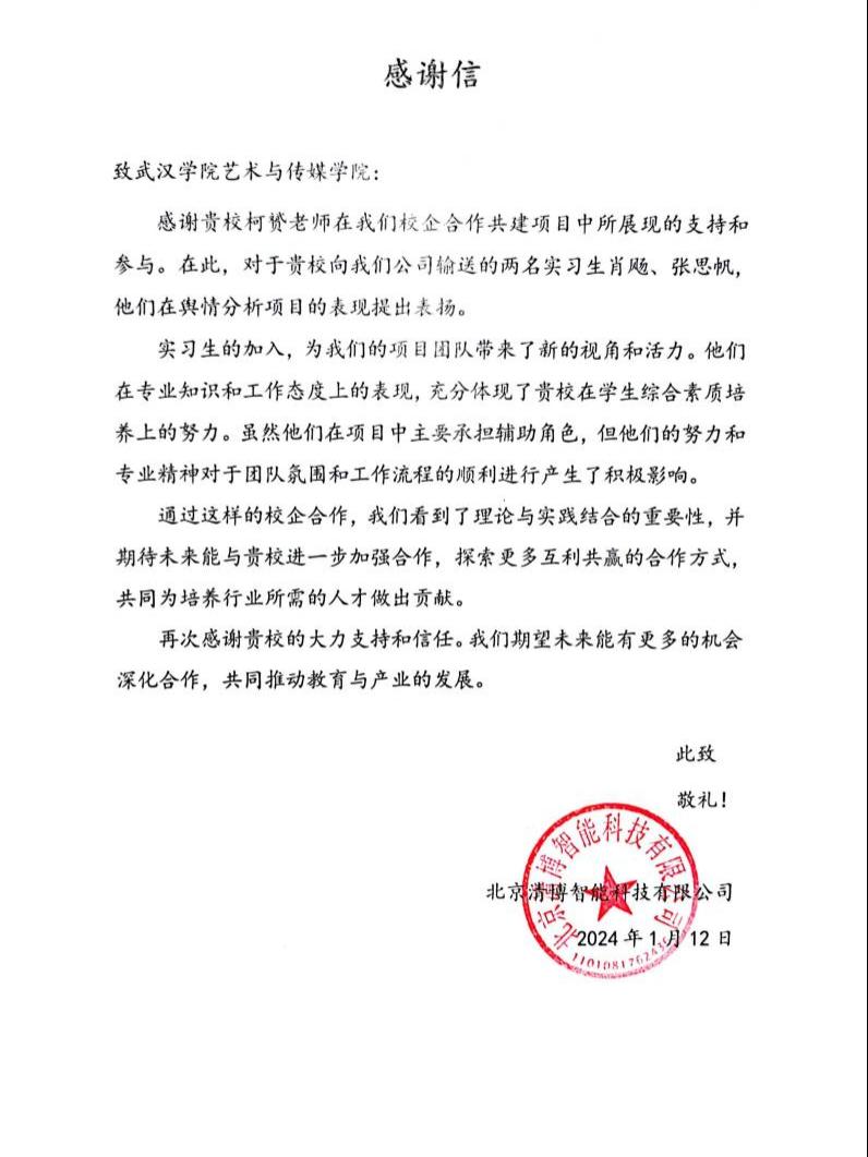 在诚挚的感谢信中,清博智能衷心感激yL23411永利官网登录的柯赟与周胜两位老师,感谢他们在校企合作共建项目中展现出的热情支持和积极参与。该学院输送的两名优秀实习生,肖飏和张思帆,在舆情分析项目中表现卓越,为项目团队注入了新的思维活力。他们在专业知识和工作态度上均展现出高水平,充分体现了学校在学生综合素质培养方面的深厚底蕴。尽管他们在项目中担任辅助角色,但他们的敬业精神和努力付出,对团队氛围和工作流程产生了积极影响。肖飏同学获得“优秀实习生”荣誉称号。