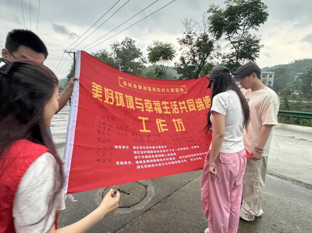 夏日的清晨,在一片炽热的天气中,一片云彩飘过,天空下起了小雨,带来了一丝丝宜人的阴凉。村民们冒着小雨陆陆续续赶到现场,带着对美好环境与幸福生活的向往,纷纷在工作坊旗帜上签下自己的名字。塘湖镇党委副书记吴宇星、通城县政法委驻南虹村第一书记胡二会等干部代表,以及工作坊导师、志愿者们也纷纷签下自己的名字,这是见证,也是承诺,见证共谋共建,承诺共管公评。