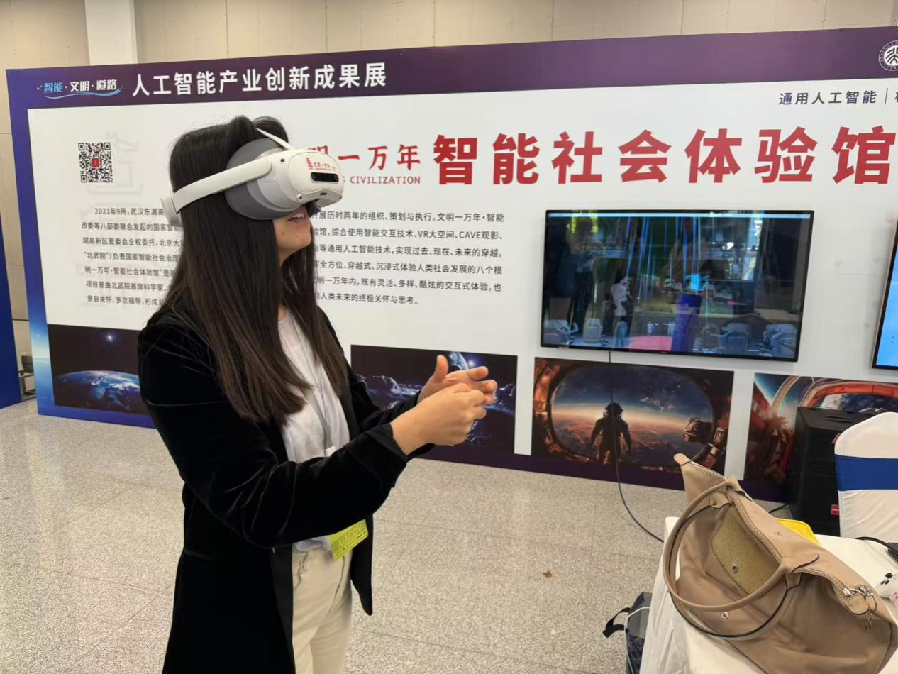 此次大会中,一项令人瞩目的人工智能艺术与设计的显著成果:“文明一万年:智能社会体验馆”,由长江学者青年学者、教授、博导、北京大学武汉人工智能研究院副院长吕鹏隆重发表。会后,各位艺术传媒学院专业老师对长江文创产业园的交互空间沉浸式体验项目“文明一万年:智能社会体验馆”VR大型社会模拟器进行了尝试,并深刻感受到了人工智能和科技发展带来的艺术与设计产业新格局。该项目板块包含六个重要文明社会环境的精良智能画面制作与人机交互设计,涵盖了从远古的史前时代起为起始到未来的高科技元宇宙文明内容,为参会者提供了宝贵的体验新科技和设计融合的机会。此次沉浸式VR大空间科普场馆项目自2022年起进行规划,占地面积接近1500平方米,展馆融了国内最先进的元宇宙与AI技术等,体现了中国科技与艺术设计融合发展的强大力量。