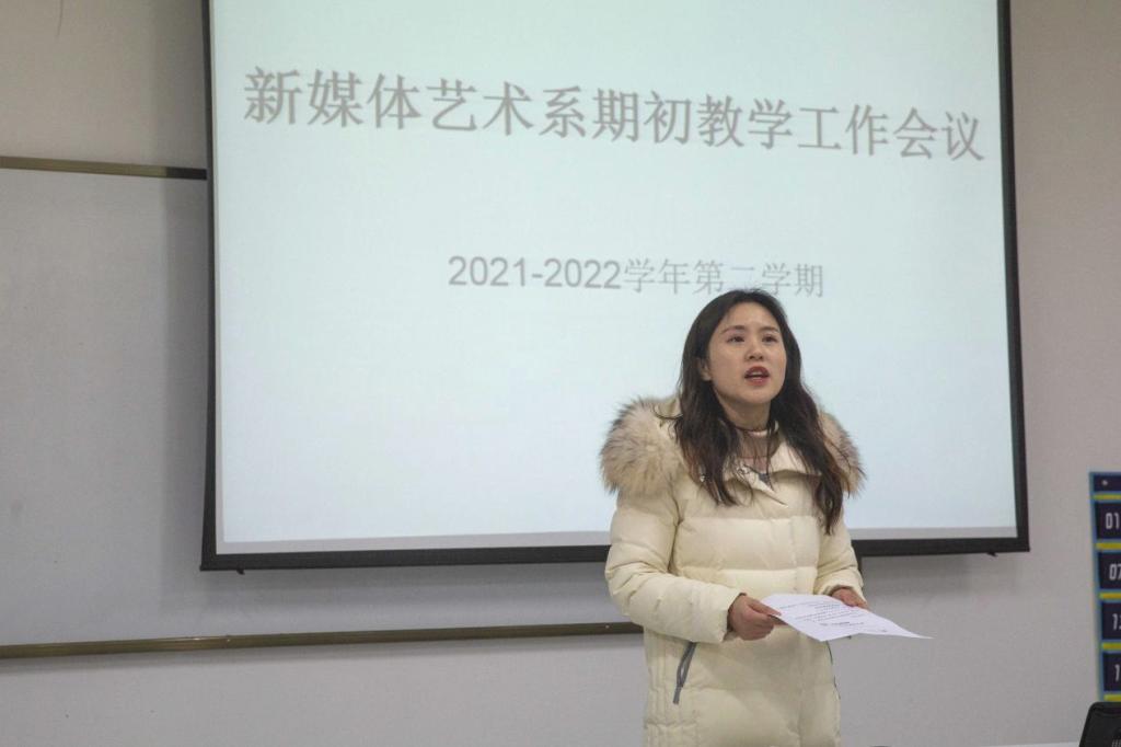 刘主任传达了李忠云校长在2021-2022学年第二学期开学大会上的讲话精神,强调教师要扎根讲台,系主任更是要服务好师生,做好工作的横向连接。她希望新媒体艺术系的三个专业教研室能保质保量分解和完成学院、学校的各项工作任务,也鼓励各位教师群策群力,为自己的专业教研室发展献计献策,多提宝贵的建议和意见,齐心协力的完成各项工作和任务。