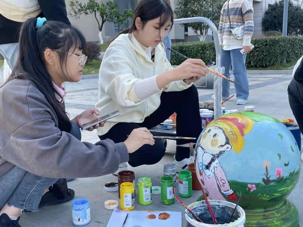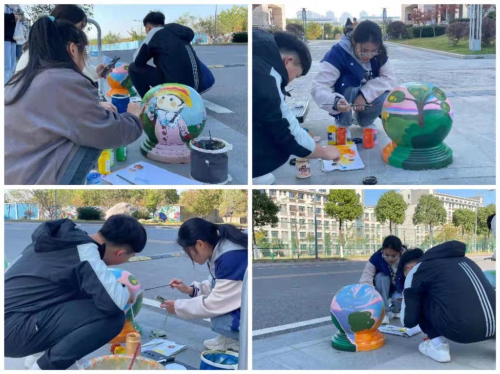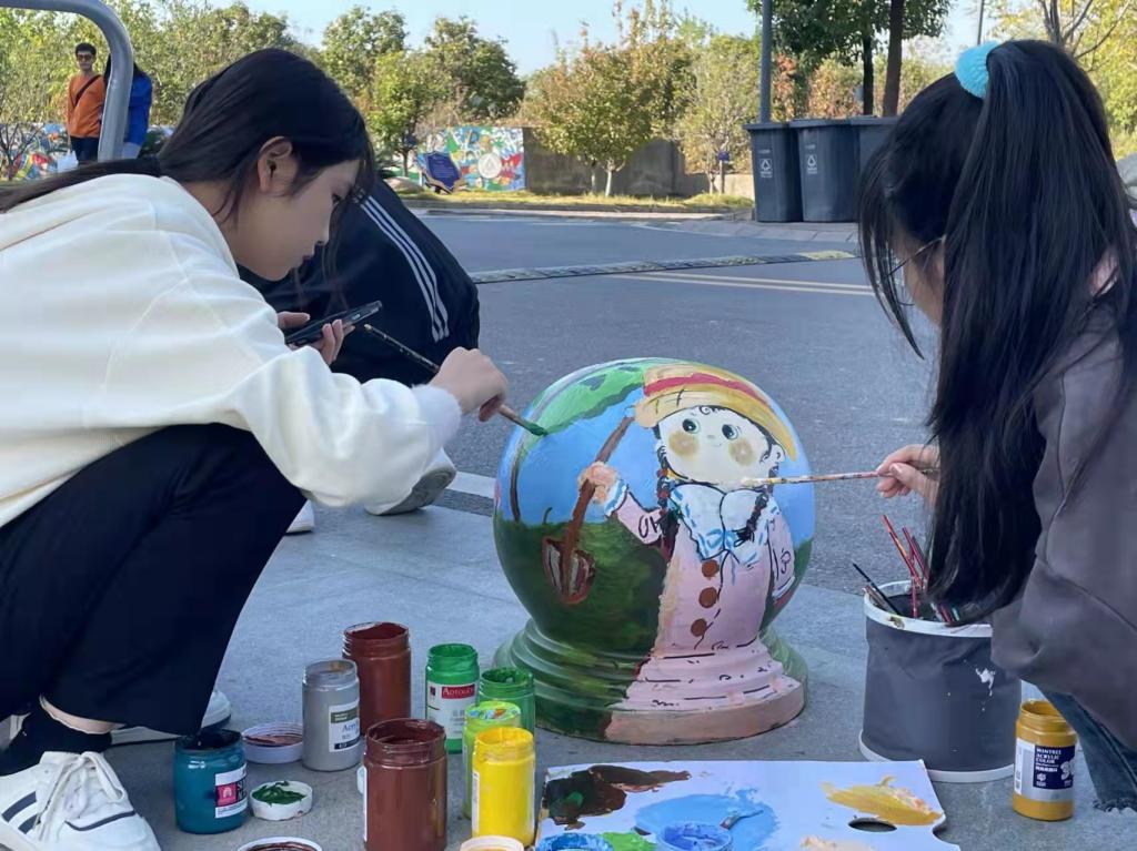 大家分工明确,热情满满。有人对石墩进行补色,有人根据主题稿件进行作画构图,勾勒出清晰的轮廓;有人负责调色,红的黄的绿的白的颜料在灵巧的双手间生成五彩斑斓符合画面的颜色;有人自我创作为石墩添加细节。期间,不少路过的同学停下了脚步驻足观看;骑着电动车的行人减慢了速度,认真地欣赏穿着“新衣服”的石墩子。