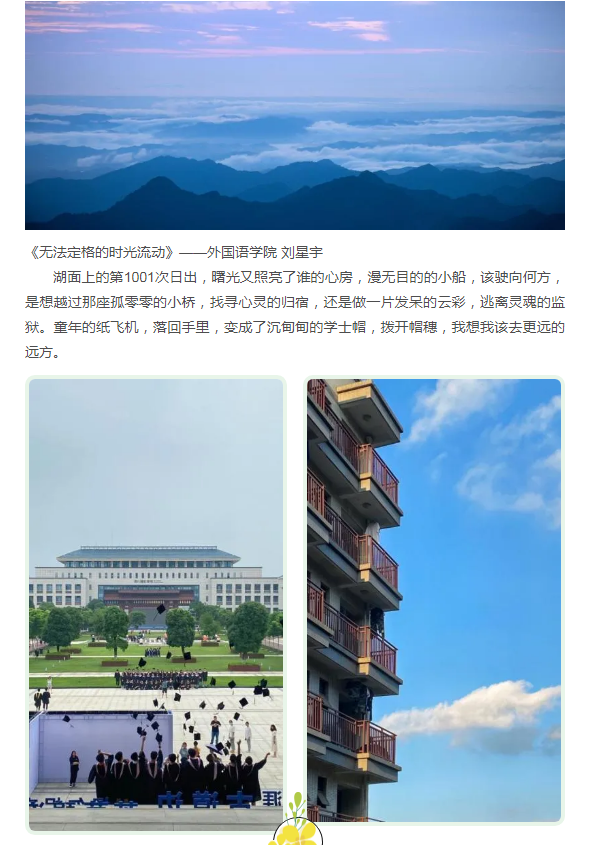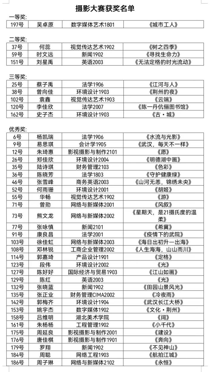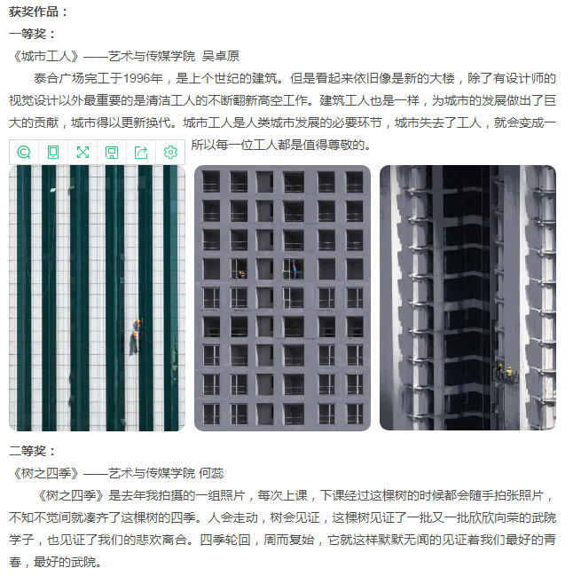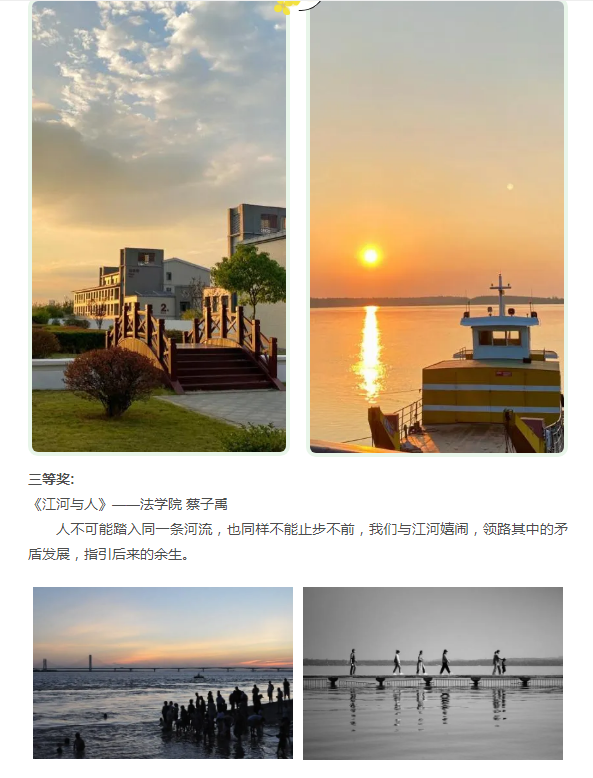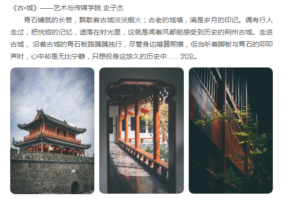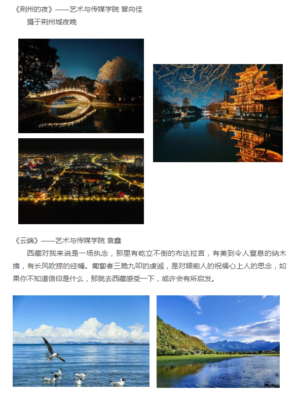 大赛自开展以来,聚集了武汉各大高校学子投稿,湖北美术学院和建筑工程学院等高校的同学也在此次大赛中投递了作品组图。在一幅幅精心构思的作品中,有的同学以人文元素为主题,通过照片感受生活中的艺术气息,也有同学以线条为基点,拍摄光影下的大山大水。在同学们的镜头下,时代、山水以及人文的风貌被展现得淋漓尽致。