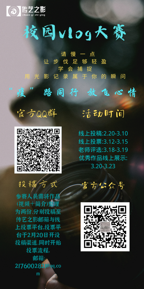 本次“疫”路同行,放飞心情校园vlog大赛为记录与发现自己生活美好时刻,题材不限,如旅游、运动、学习、穿搭、生活搞笑片段、翻拍等等。意旨通过对自己生活中的记录或者疫情期间看到的温暖、感人时刻的所思所想,将其制作成一个vlog,分享自己快乐的同时传递积极向上的生活态度。