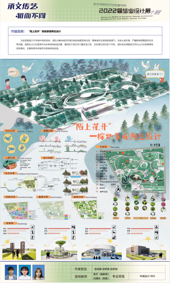 设计说明:为实现我国2050年碳中和的目标,团队从解决城市环境污染的角度思考出发,聚焦城市垃圾场问题。选取长山口垃圾场作为未来棕地改造对象,综合调查武汉市长山口垃圾填埋场实际情况,主要构想未来城市垃圾场棕地改造。